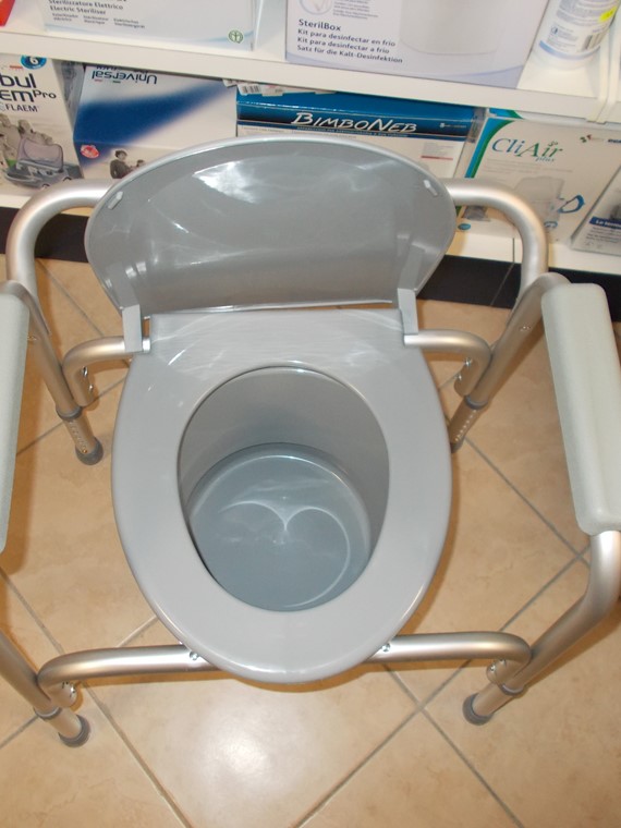 Water a comoda in alluminio regolabile in altezza, con coperchio di chiusura, secchiello con coperchio rimovibile di facile pulizia, leggero, con appoggio braccia, portata kg.120, completo di poggiaschiena.