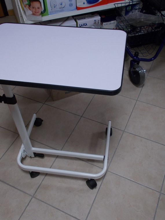 Tavolino multifunzionale, pieghevole, realizzato in acciaio cromato e rivestito, puo' essere utilizzato a letto, su sedia o sedia a rotelle, la superficie laminata facile da pulire, ha bordi rialzati con gli angoli aperti e puo' essere inclinato per la lettura. il tavolino e' dotato di rotelle che possono essere bloccate per evitare che il tavolo si sposti una volta raggiunta la posizione desiderata, altezza da cm 66 a cm 98 carico max kg.10.