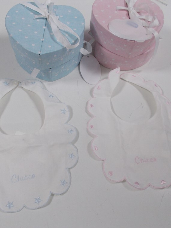 Bavaglini in cotone ricamati rosa e azzurri in confezione scatolina cuore ideale per piccolo cadeaux.