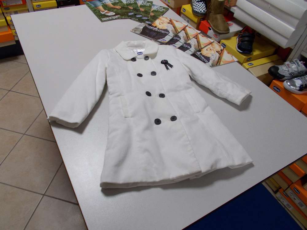 Cappottino Chicco Bianco con coccarda in morbido tessuto, modello lounghette, taglia 4 anni fine serie, scontatissimo.