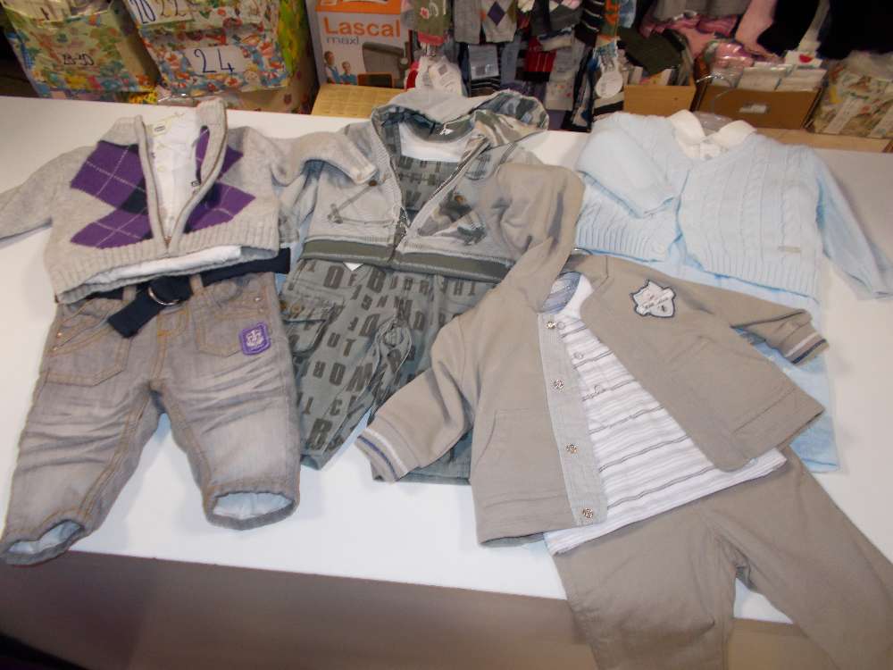 Completini Chicco maschietto, in vari tessuti e colori, tre pezzi e due pezzi, completi di cardigan e giubbini con salopette e pantaloncini, in promozione a metà prezzo.