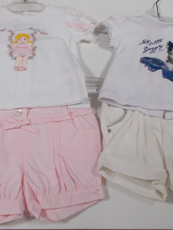 Completini bimba maglia manica corta o canotta + pantaloncino o gonna in misure da 3 mesi a 6 anni in vari colori e fantasie stampate o ricamate.