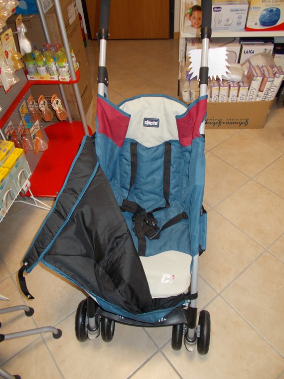 Passeggino chicco light completo di cestino portaoggetti, parapioggia, coprigambe invernale, chiusura ad ombrello, ruote piroettanti, freno posteriore, in colore jeans-beige-bordeaux, pratico e leggero.