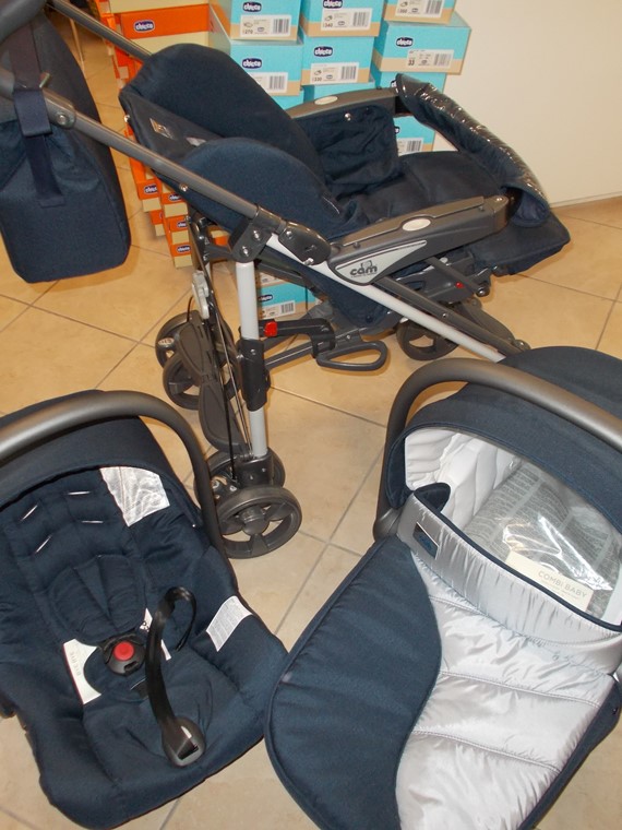 Trio cam reversibile, completo di passeggino, cesta e poltroncina auto 0-9 kg, cesta portaoggetti, borsa in abbinamento, cappottina parapioggia, coprigambe invernale, fondo cesta aereato, cinture di sicurezza, pedana poggiapiedi, ruote piroettanti, in colore blu con inserti grigio metalizzato.