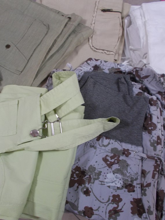 Pantaloni pinocchietto (fantasia floreale e rigato rosa), lunghi (lino bianco, lino verde e lino beige), salopette lunga cotone verde menta, offertissima fine serie taglie miste.