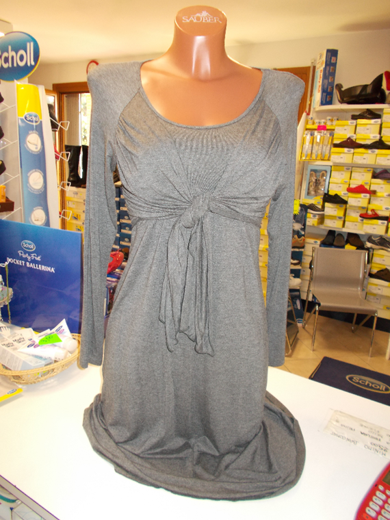 Abito in versione grigio melange, con nodo sotto il petto, scollo rotondo, lunghezza al ginocchio in confortevole viscosa, taglie XS-S.