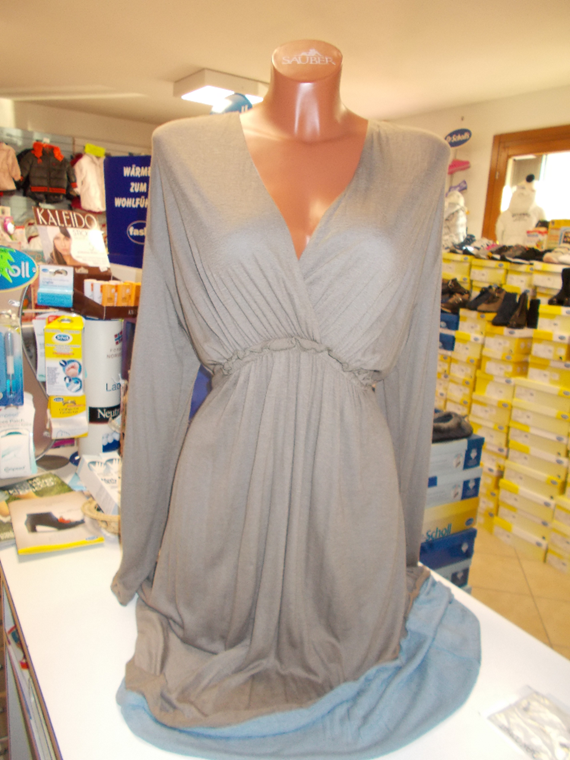 Abito scollo a V con arricciatura sottoseno, laccetto posteriore, in morbida viscosa, da un lato in colore fango e dall'altro in colore azzurro melangiato. In taglia XL e Small.