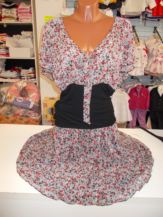 Abito floreale, manica corta con inserti neri, scollo a V in fresca viscosa, taglie M-L-XL-XXL.