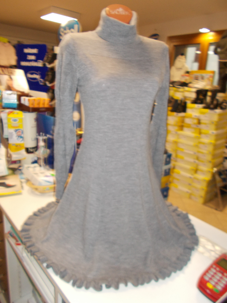 Abito sopraginocchio, grigio tinta unita con collo e bordo inferiore in contrasto marrone, taglio e arricciatura sottoseno, taglia XS.