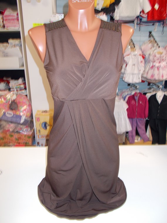 Abito smanicato, marrone con applicazioni alle spalle in fresco poliestere, taglia S.