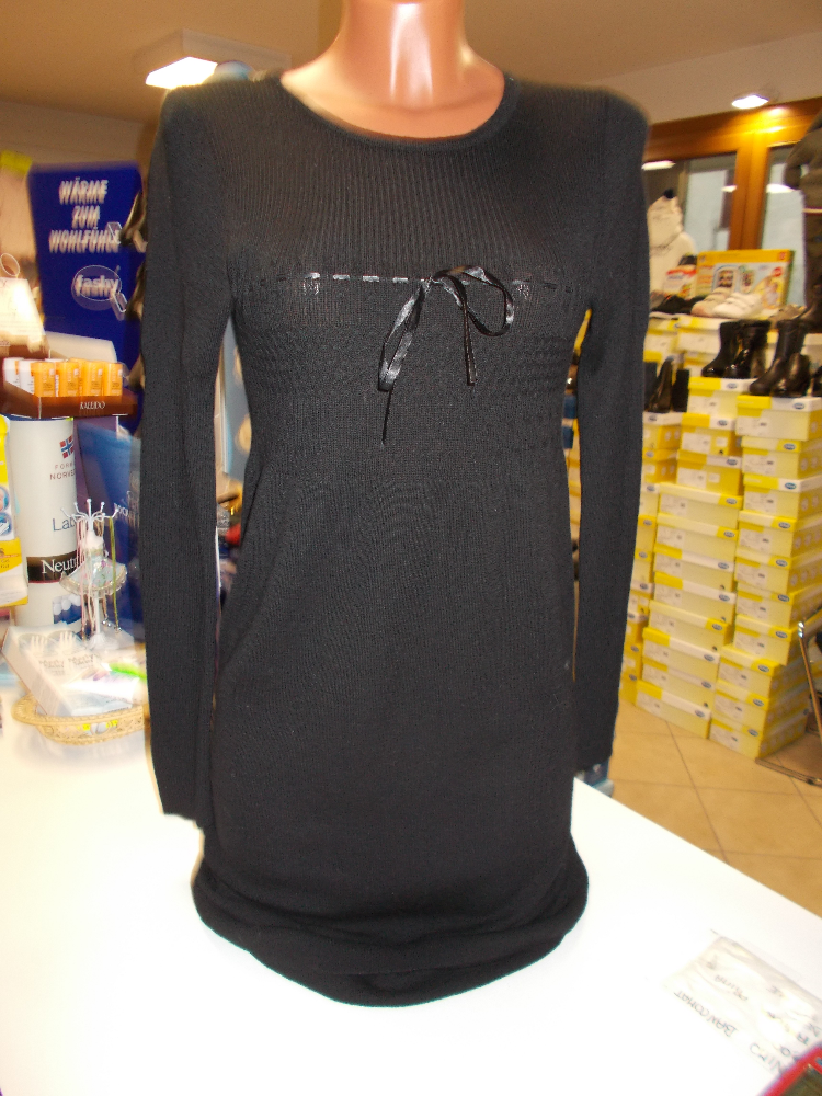 Abito nero composizione 100% lana merinos, motivo a laccetto sul petto, collo rotondo, taglie XS-XL.