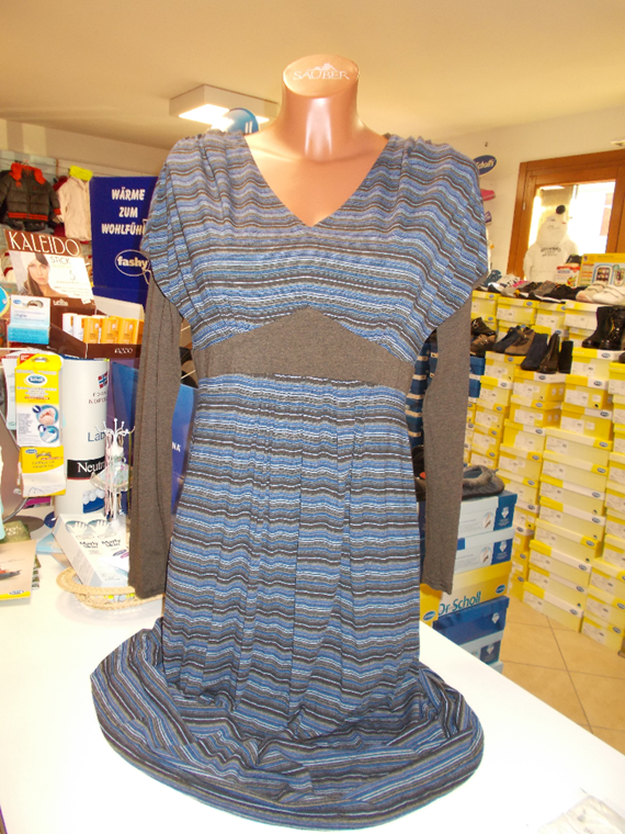 Abito rigato blu- marrone - grigio, taglie XS-Small, motovo a fascia sottoseno, scollo a V, maniche in contrasto marroni tinta unita in morbida viscosa, arricciatura alle spalle.