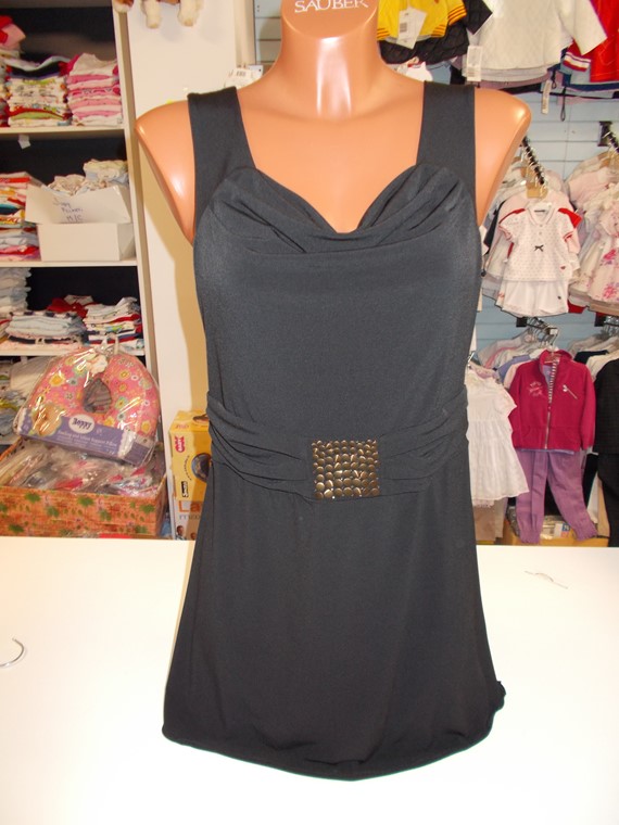 Abito smanicato nero con inserti bianchi e cintura bianco-nero, in fresco poliestere taglie S-M-L.