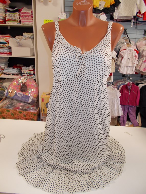 Abito spallina stretta fondo beige pois neri, rouche allo scollo in fresco poliestere, foderato, taglie S-M-L.