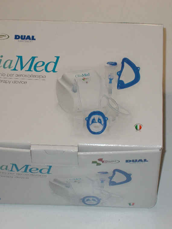 Apparecchio per aerosolterapia con compressore a pistone, alimentazione 230V, funzionamento continuo, nebulizzatore Dual Speed, capacità di farmaco da 2 ml a 8 ml, rumorosità contenuta, formato compatto.
