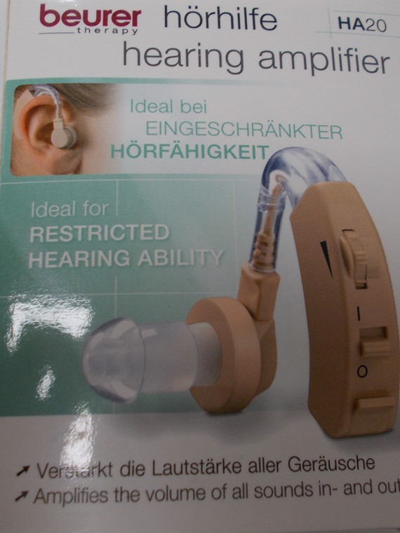 Apparecchio acustico, amplifono, forma ottimale per l'applicazione dietro l'orecchio, 3 accessori per l'adattamento al canale auricolare, volume a regolazione graduata, volume max 128 dB, praticamente invisibile con custodia per la conservazione, alimentazione a batteria.