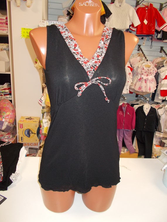 Canotta con spallina a sottoveste in fresca viscosa floreale verde-giallo, ampia scollatura con bottoncini, laccetti sottoseno, foderata, taglie 46-48.