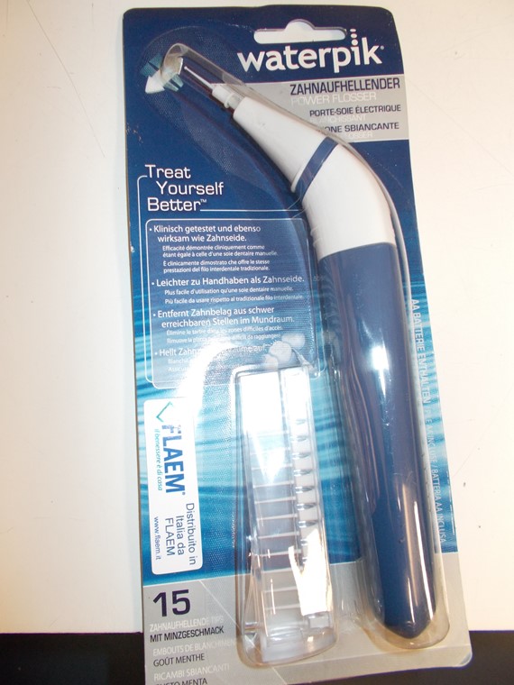 Dispositivo elettrico Waterpik sbiancante dentale, clinicamente testato, più facile da usare rispetto al tradizionale filo interdentale, assicura una azione sbiancante, rimuove la placca nelle zone difficili da raggiungere. Fornito con 16 ricambi inclusi nella confezione.