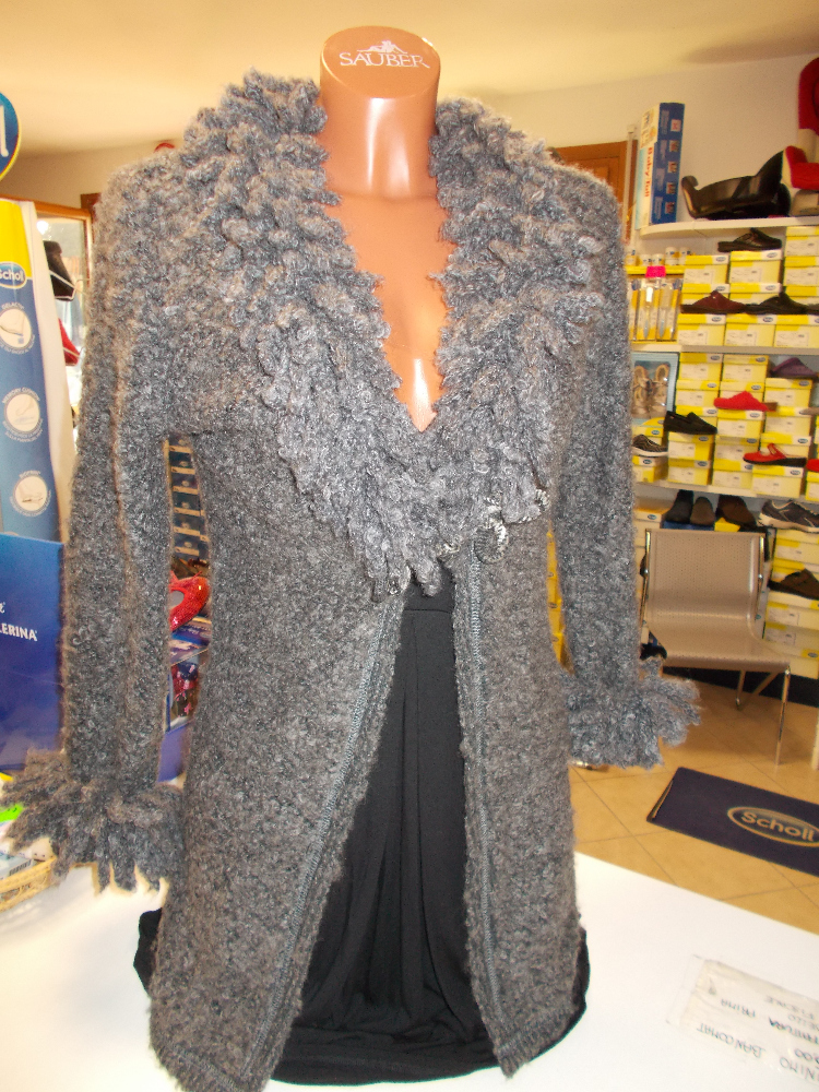Giacca lana lunga, lavorazione ricciolino con collo e polsi effetto pelliccia in colore grigio melange, chiusura con alamarro sottoseno, taglia Small.