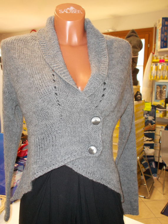 Golfino taglio giacca con abbottonatura doppiopetto, collo a scialle, colore grigio melange, taglia Small, in morbida lana.