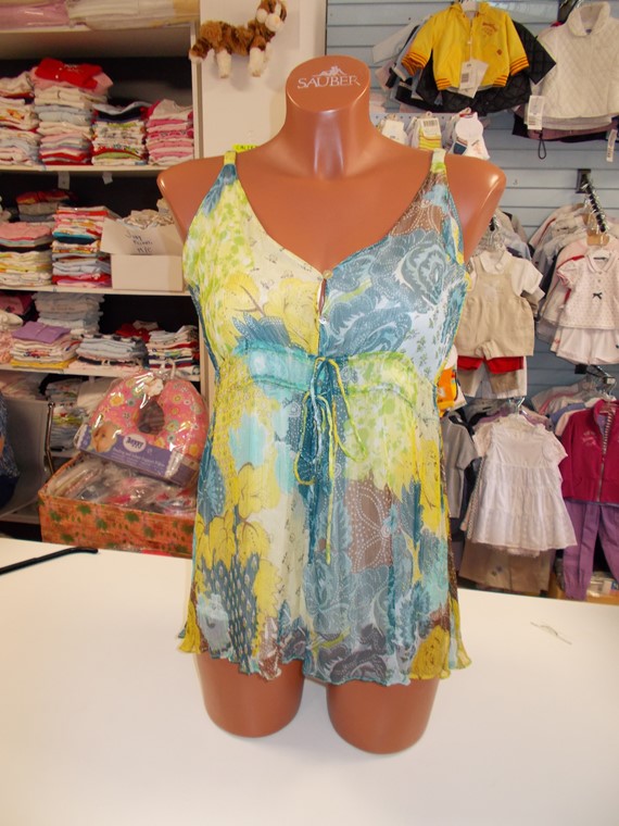Maglia fantasia bluette, in fresca viscosa con laccetto allo scollo taglia small.