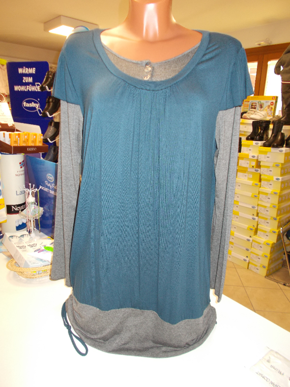 Maglia Lunga grigio melange, scollo a V grigio scuro in contrasto, arricciatura al fondo, pieghe all'anteriore, in morbida viscosa, taglia Small.