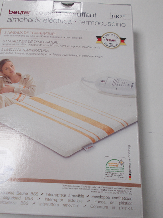 Fodera esterna in cotone lavabile, potenza 55 watt, alimentazione 230 V, dotato di termoprotettore che interrompe il flusso di corrente elettrica nel dispositivo in caso di uso prolungato o calore eccessivo.
